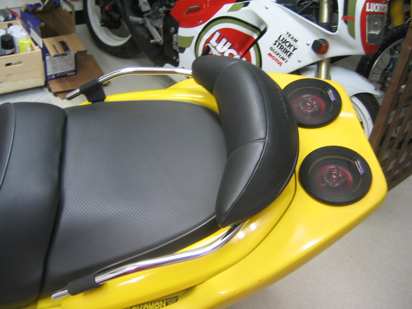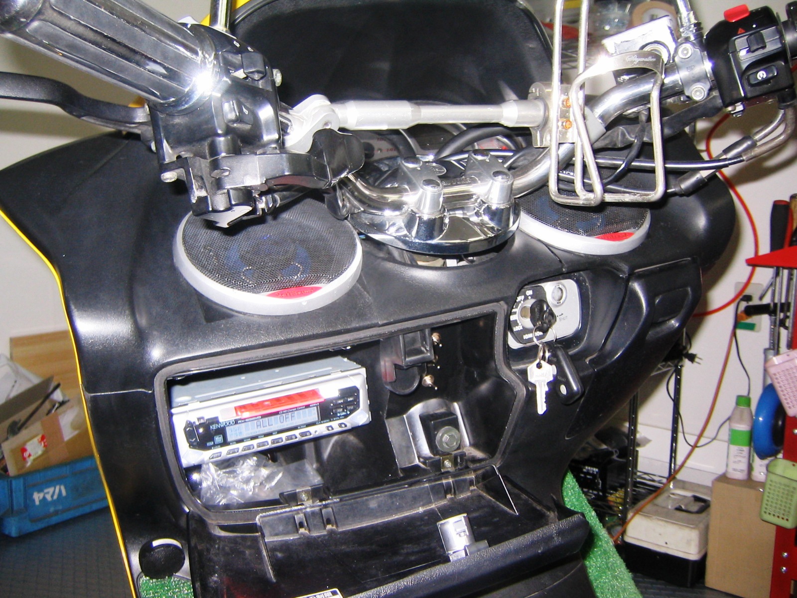 このマジェ、ツイータ入れて6スピーカ仕様です。リアに追加入れると屋外とはいえ音に広がりが出ます。当然防水です。